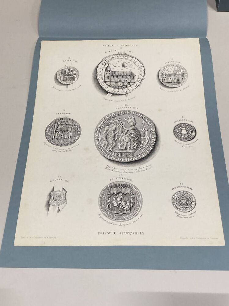 Losbladig exemplaar van het boek Friesche Oudheden (proefdruk?), met een stapel afbeeldingen