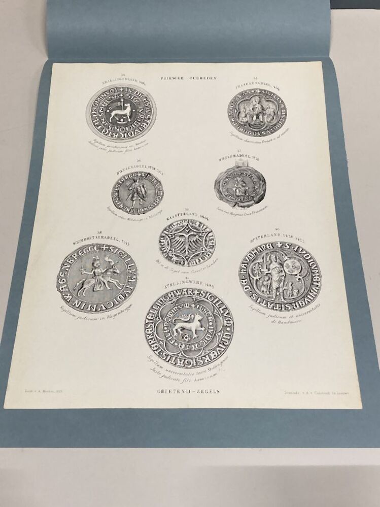 Losbladig exemplaar van het boek Friesche Oudheden (proefdruk?), met een stapel afbeeldingen