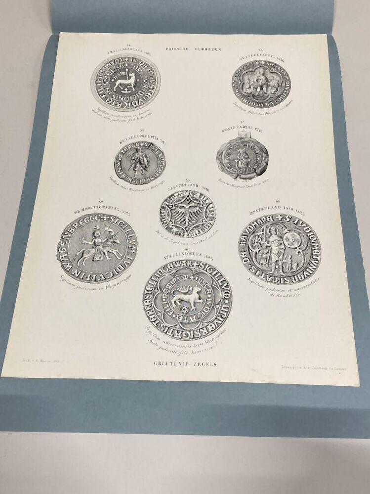 Losbladig exemplaar van het boek Friesche Oudheden (proefdruk?), met een stapel afbeeldingen