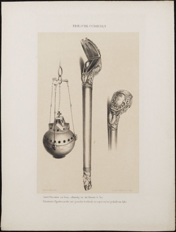 Losbladig exemplaar van het boek Friesche Oudheden (proefdruk?), met een stapel afbeeldingen