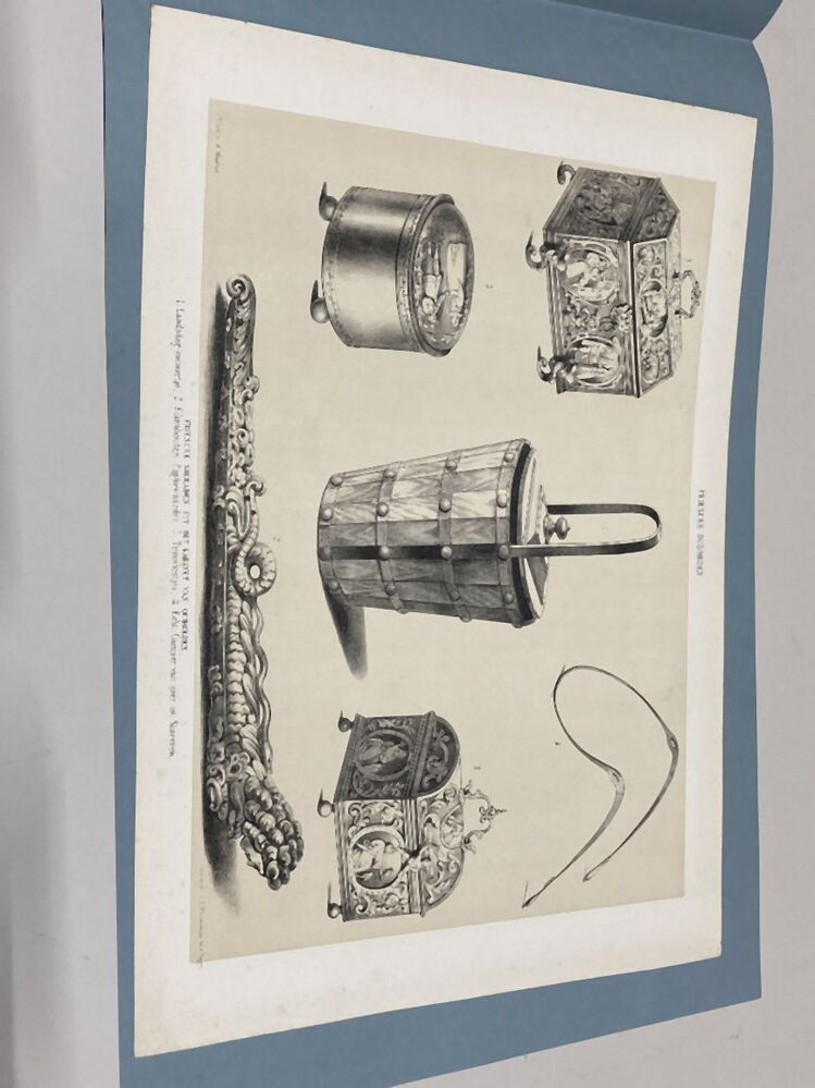 Losbladig exemplaar van het boek Friesche Oudheden (proefdruk?), met een stapel afbeeldingen