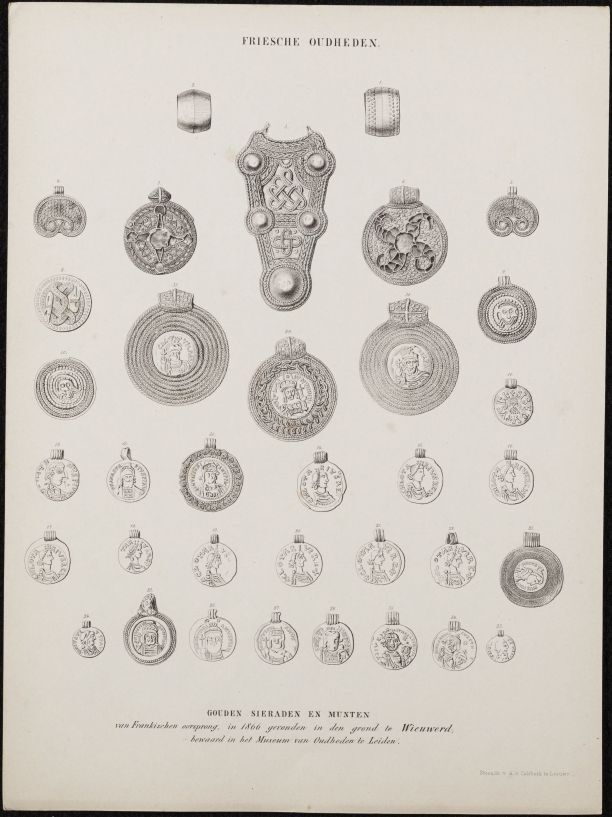 Losbladig exemplaar van het boek Friesche Oudheden (proefdruk?), met een stapel afbeeldingen