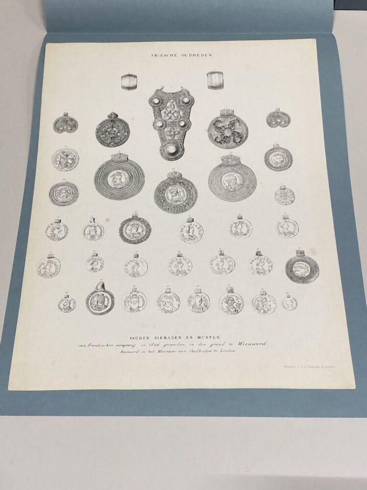 Losbladig exemplaar van het boek Friesche Oudheden (proefdruk?), met een stapel afbeeldingen