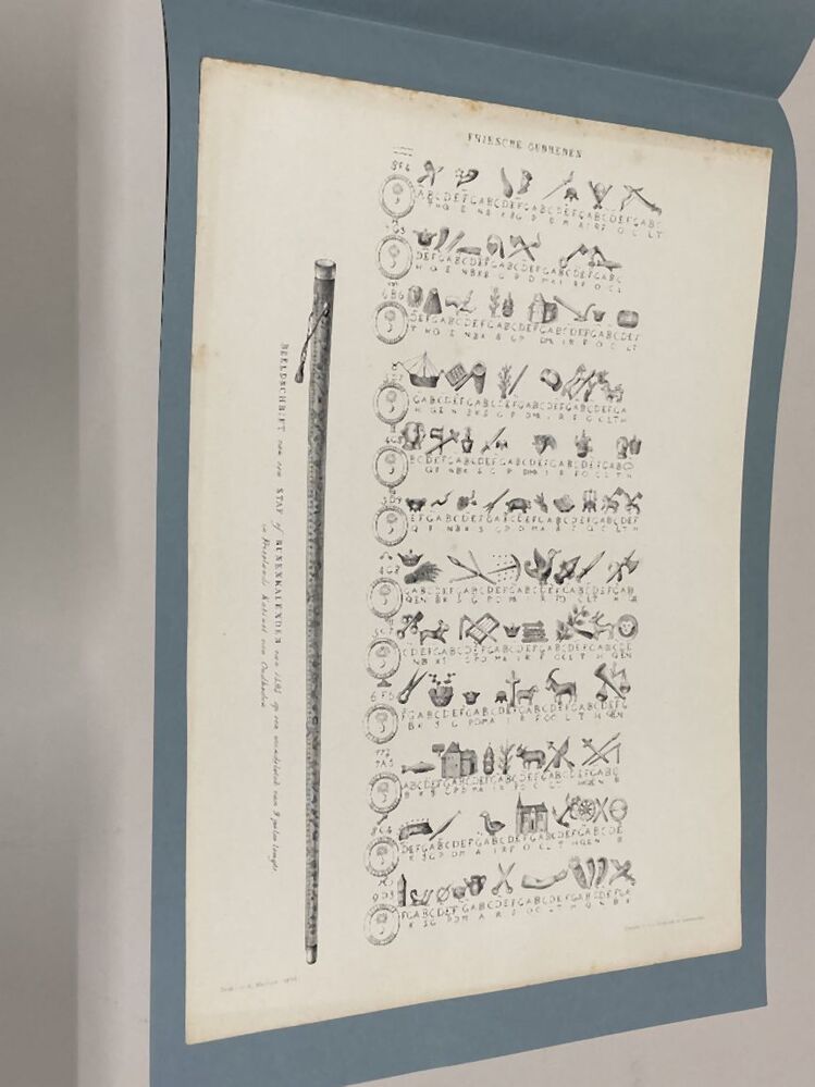 Losbladig exemplaar van het boek Friesche Oudheden (proefdruk?), met een stapel afbeeldingen