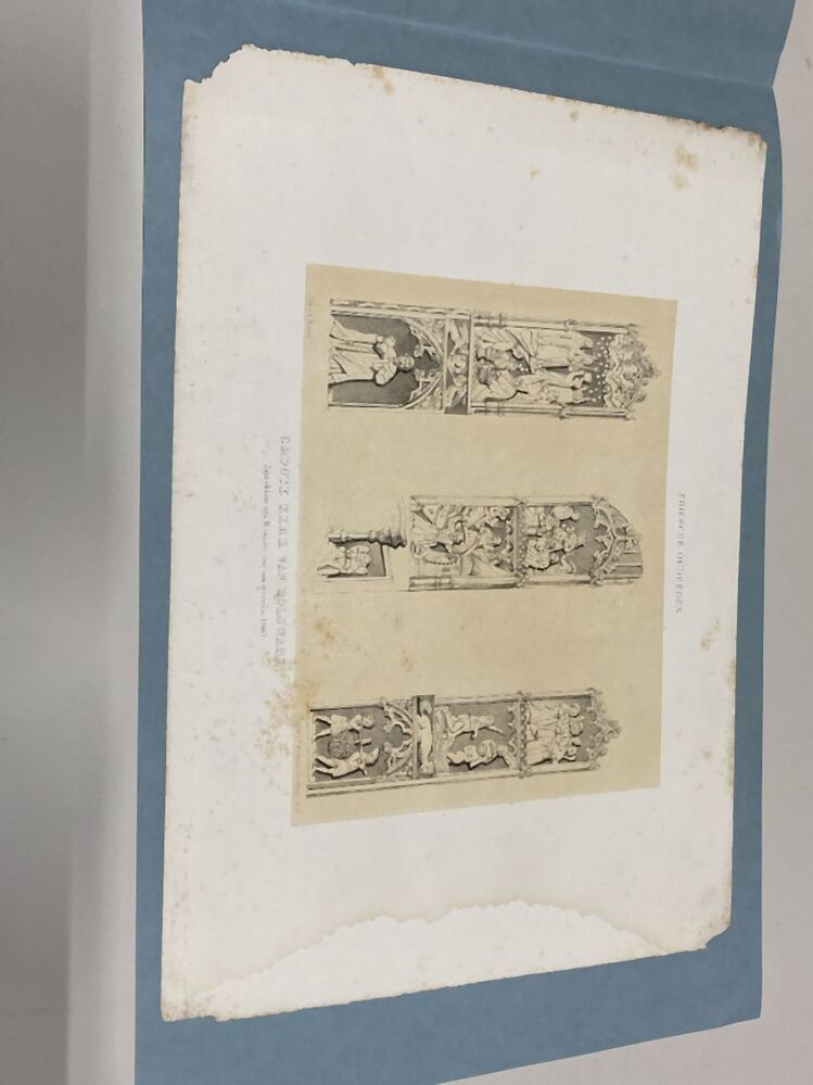 Losbladig exemplaar van het boek Friesche Oudheden (proefdruk?), met een stapel afbeeldingen