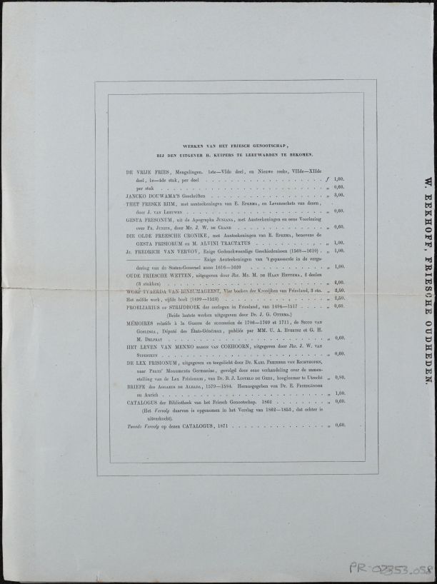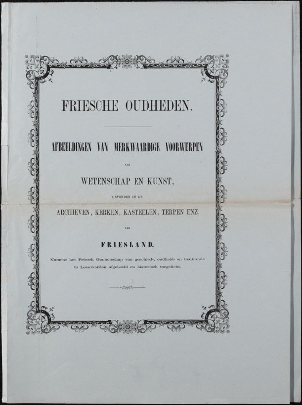 Losbladig exemplaar van het boek Friesche Oudheden (proefdruk?), een map met tekstbladen in omslag met de boektitel