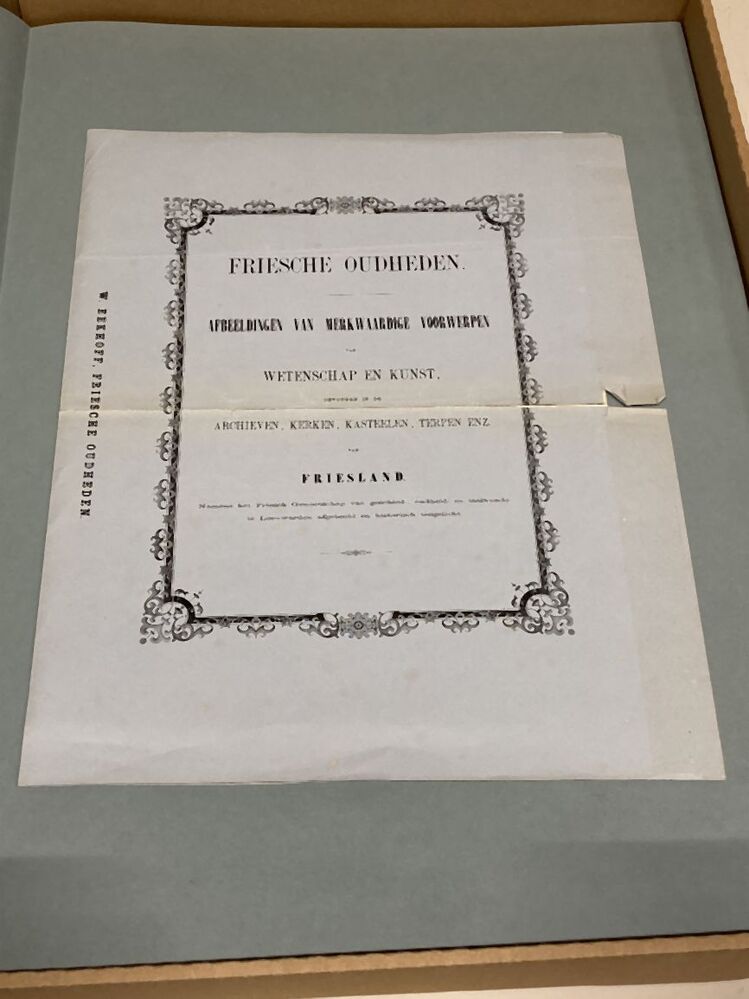 Losbladig exemplaar van het boek Friesche Oudheden (proefdruk?), een map met tekstbladen in omslag met de boektitel