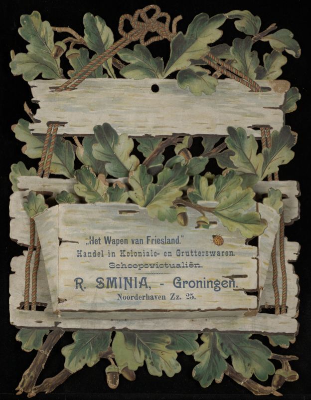 Kartonnen houder voor briefpapier of post in de vorm van een houten bak met eikenbladeren, van Het Wapen van Friesland, Handel in Koloniale- en Grutterswaren. Scheepsvictualiën. R. Sminia, Groningen