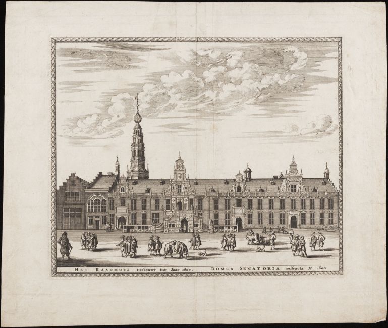 Map Zuid-Holland met 1 afbeelding van poorten, stadhuis, Burg en andere gebouwen te Leiden