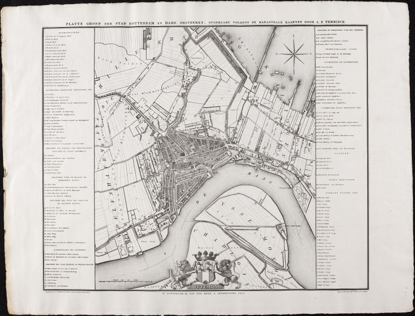 Map Zuid-Holland met 1 afbeelding van Rotterdam, plattegrond met legenda's en gezichten om, op en in de stad