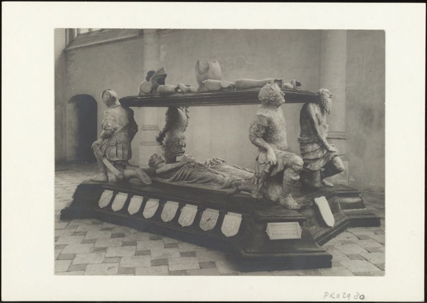 Sarcofaag van Julius Caesar met op elk van de vier hoeken een geknielde man die samen een plateau dragen met daarop een wapenuitrusting