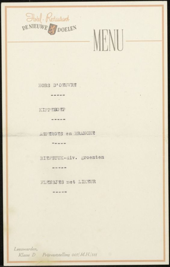 Menukaartje Hotel - Restaurant De Nieuwe Doelen