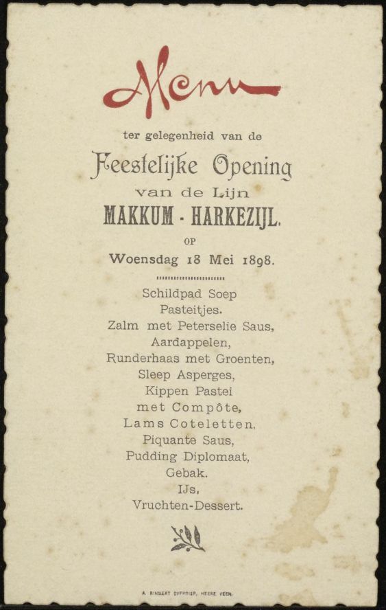 Menukaartje Feestelijke Opening van de Lijn Makkum - Harkezijl