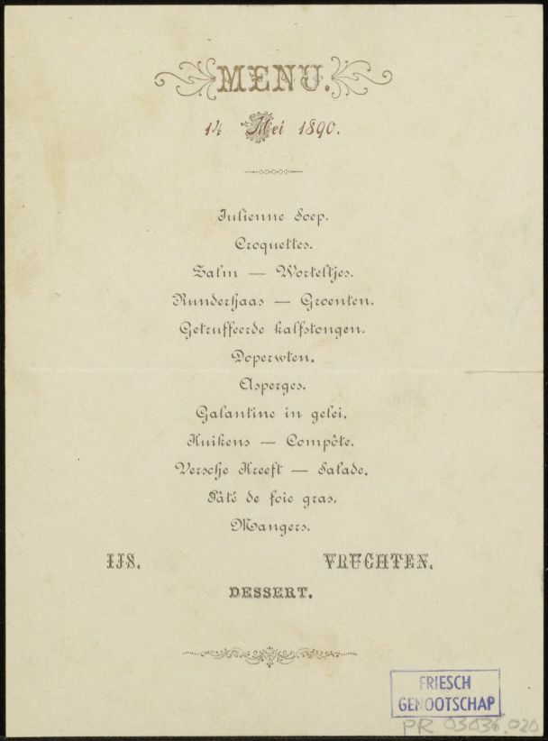 Menukaartje Friesch Genootschap