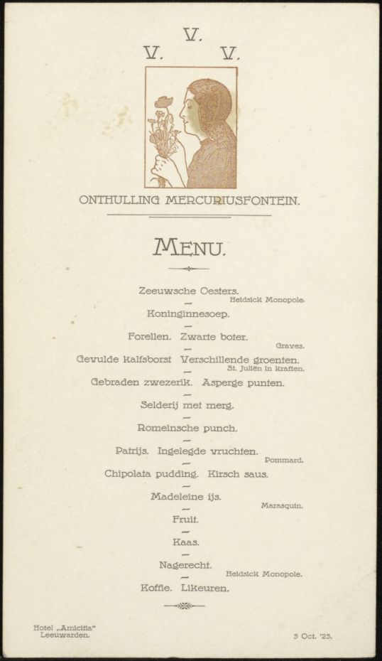 Menukaartje Hotel Amicitia Leeuwarden Onthulling Mercuriusfontein
