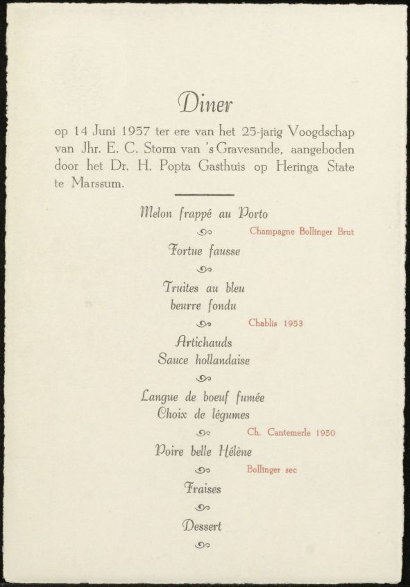Menukaartje van een diner op Heringa State in Marssum