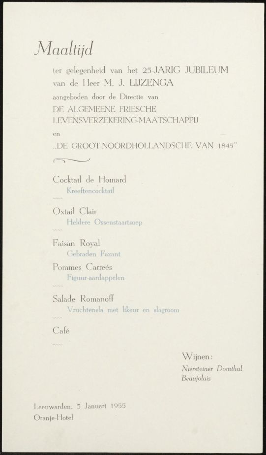 Menukaartje Oranje Hotel