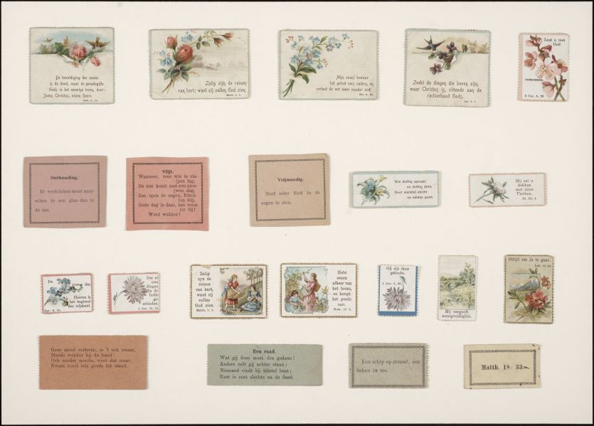 105 kleine zegels en kaartjes met stichtelijke teksten