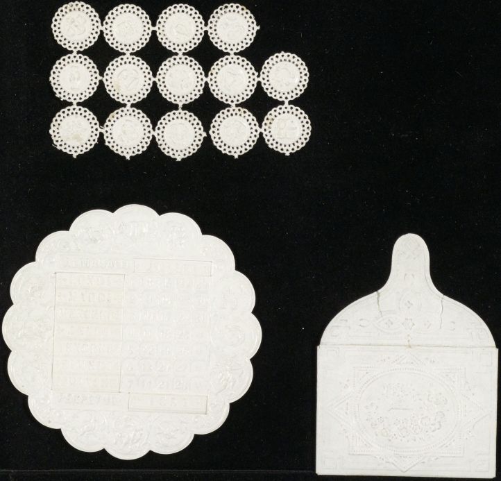 3 verschillende gestanste witte papieren versiersels die in een album of op een foto geplakt kunnen worden, o.a. een klein kalendertje en kleine papieren zegeltjes