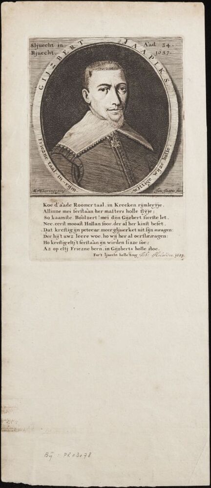Afdruk van koperplaat met portret van Gijzbert Jaapiks / Gijsbert Japiks en tekst, onderdeel van koperplaat met afdruk