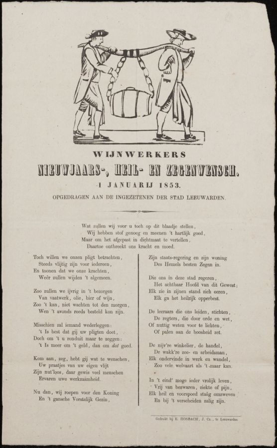 Nieuwjaarswens van de wijnwerkers van Leeuwarden voor het jaar 1853