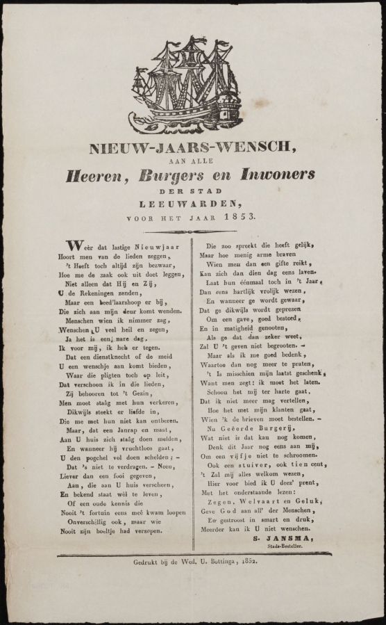 Nieuwjaarswens van de wijkboden van Leeuwarden, voor het jaar 1853