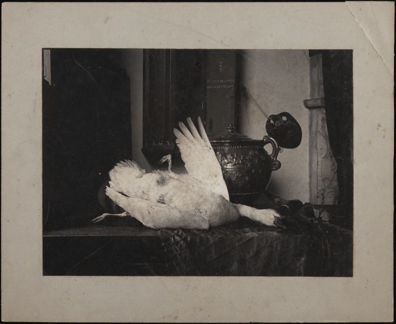 Foto van stilleven met dode zwaan en grote aardewerken pot, naar schilderij van Christoffel Bisschop