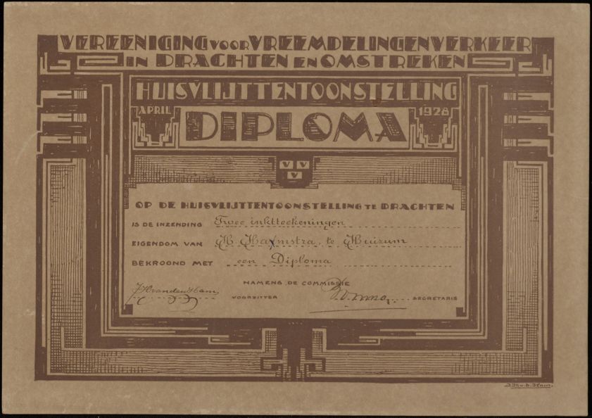 Diploma voor Hamstra uit Huizum voor de inzending van twee inkttekeningen op de huisvlijttentoonstelling van 1928