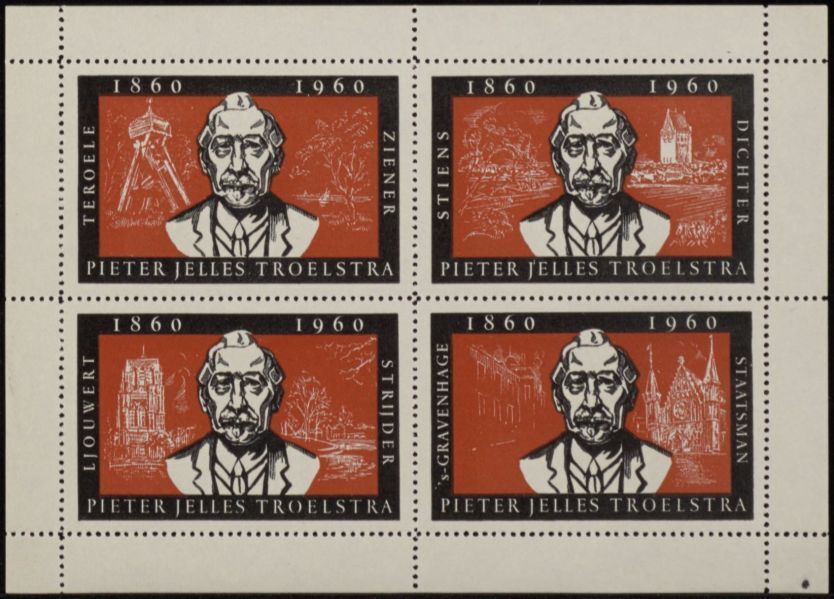 Vel met 4 postzegels ter ere van de herdenking van 100 jaar Pieter Jelles Troelstra, 1860-1960
