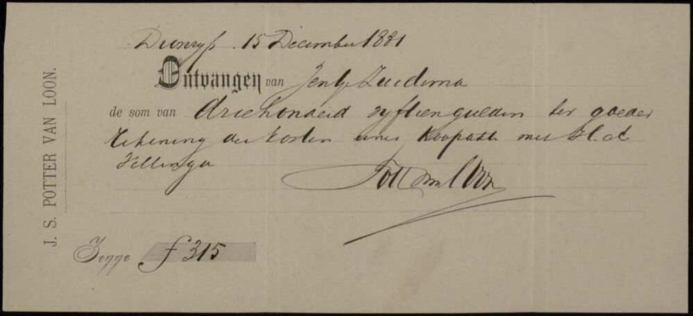 Kwitantie van 315 gulden van J.S. Potter van Loon, 1881