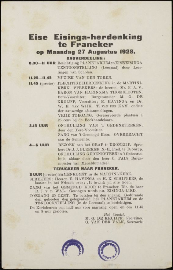 Programma van de Eise Eisinga-herdenking te Franeker, maandag 27 augustus 1928