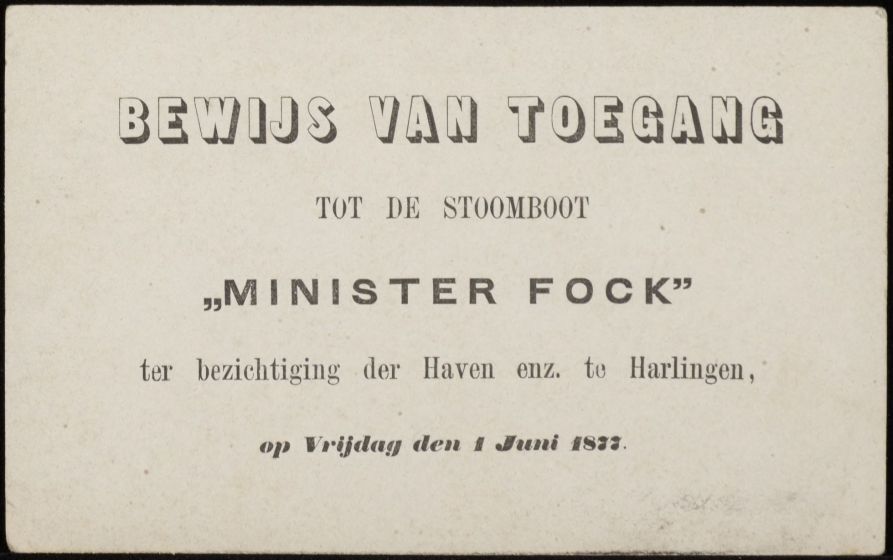 Bewijs van toegang / tot de stoomboot / minister Fock / ter bezichtiging der Haven enz. te Harlingen / op Vrijdag de 1 Juni 1877