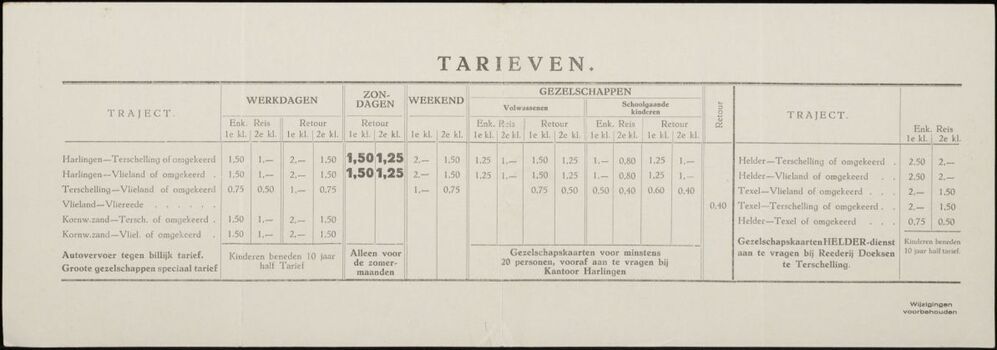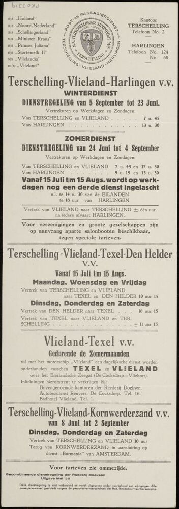 Dienstregeling van Post en Passagierdienst Terschelling, Vlieland en Harlingen