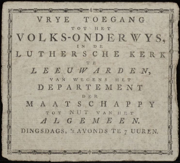 Toegangsbewijs voor vrije toegang tot het Volks-onderwijs in de Lutherse kerk te Leeuwarden