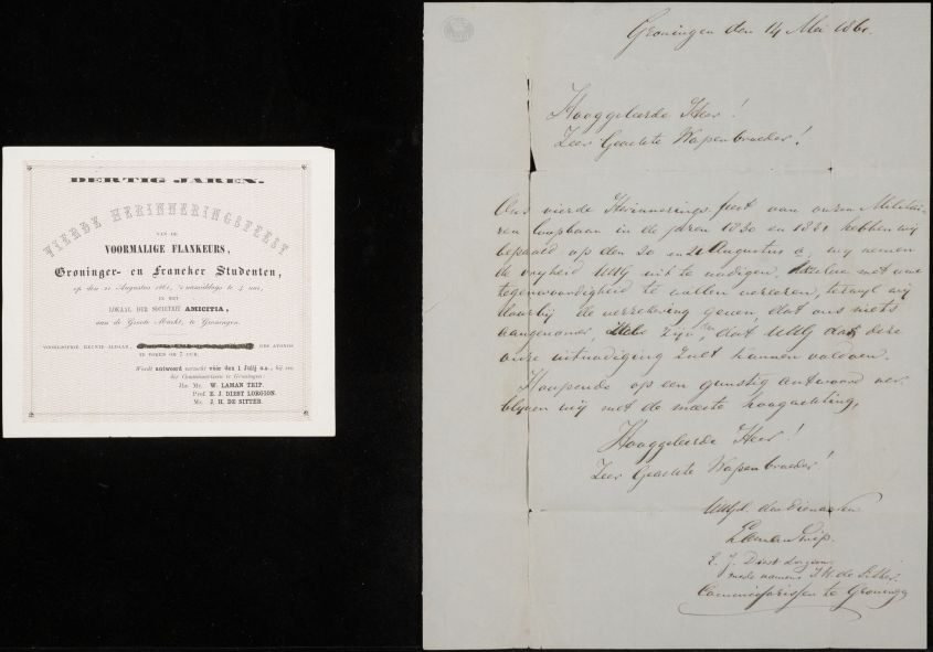 Handgeschreven brief en kaart met uitnodiging voor het vierde herinneringsfeest van voormalige flankeurs, Groninger-en Franeker studenten, 14 mei 1861