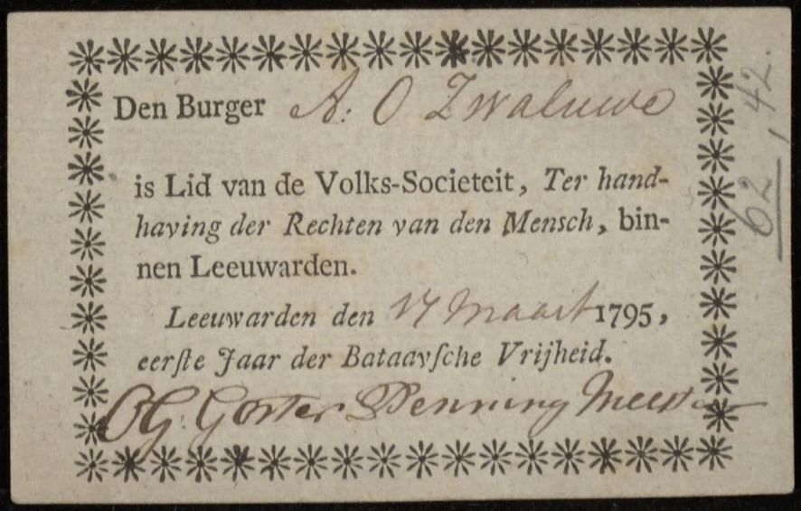 Lidmaatschapskaart A. O. Zwaluw, Volks-Societeit, Ter handhaving der Rechten van den Mensch, binnen Leeuwarden