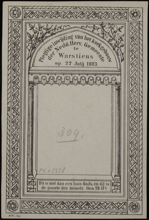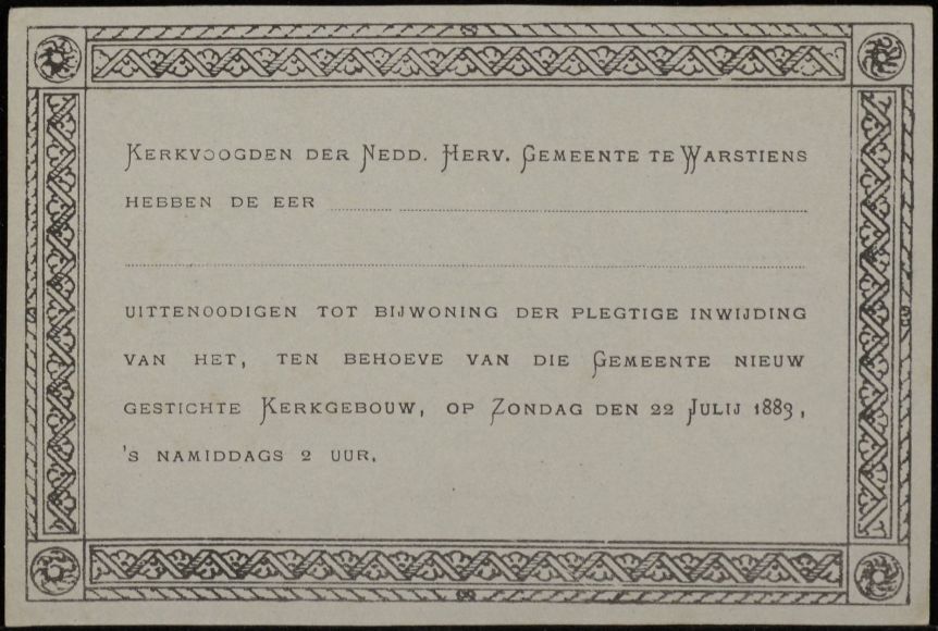 Uitnodiging tot bijwoning inwijding nieuw gestichte kerkgebouw te Warstiens, 22 juli 1883