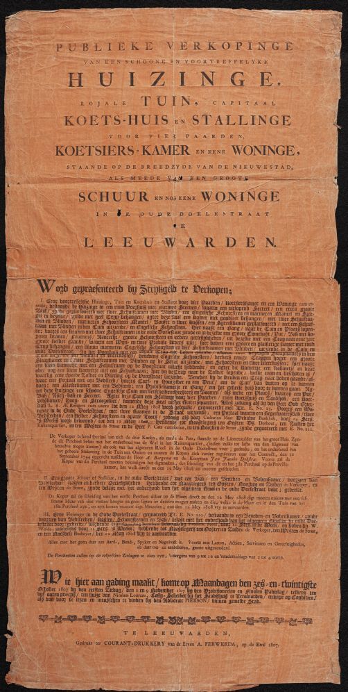 Publieke verkopinge /van een schoone en voortreffelyke / huizinge, toebehorende aan den oud-Grietman LA (?) baron Rengers