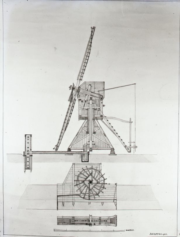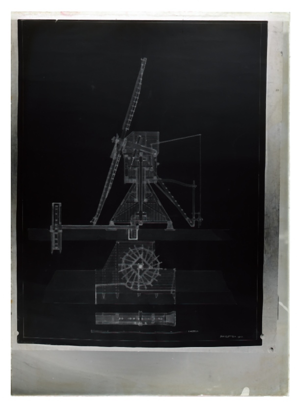 Doos met 20 glasnegatieven van de oude bibliotheek en de tuin van de Kanselarij te Leeuwarden en van ontwerptekeningen van molens door J. Westra in 1933