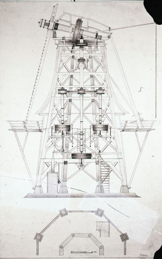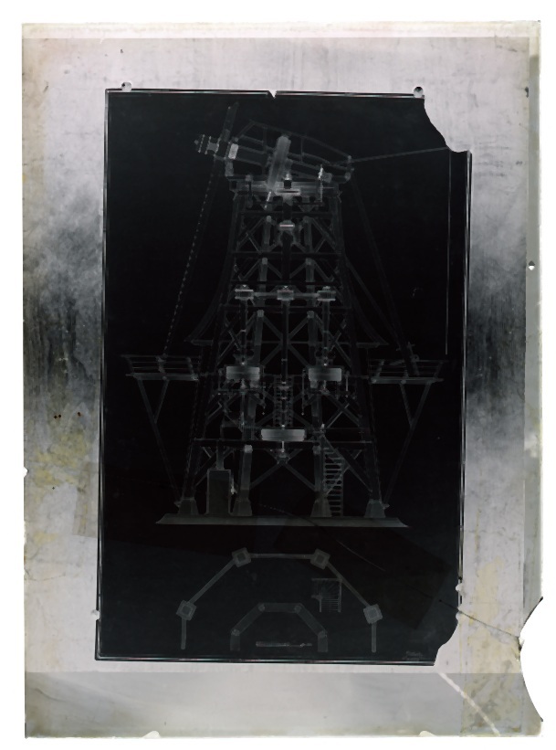 Doos met 20 glasnegatieven van de oude bibliotheek en de tuin van de Kanselarij te Leeuwarden en van ontwerptekeningen van molens door J. Westra in 1933