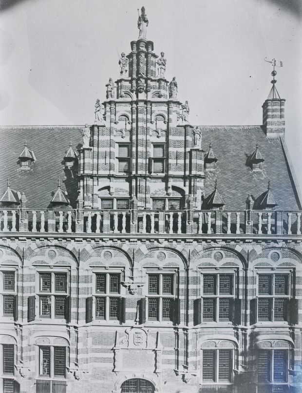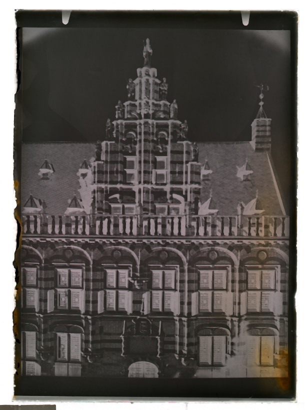 Doos met 20 glasnegatieven van de oude bibliotheek en de tuin van de Kanselarij te Leeuwarden en van ontwerptekeningen van molens door J. Westra in 1933