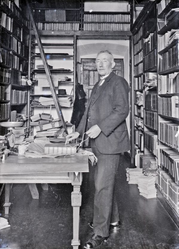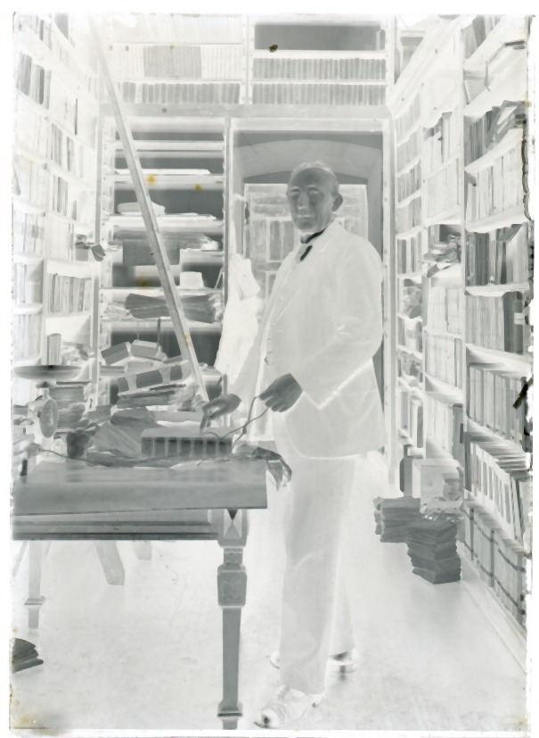 Doos met 20 glasnegatieven van de oude bibliotheek en de tuin van de Kanselarij te Leeuwarden en van ontwerptekeningen van molens door J. Westra in 1933