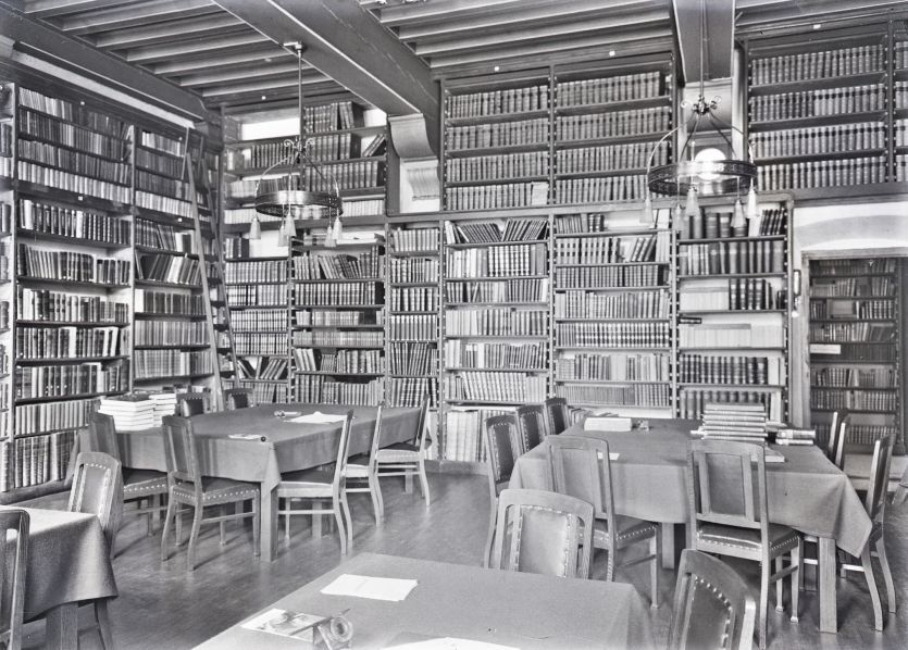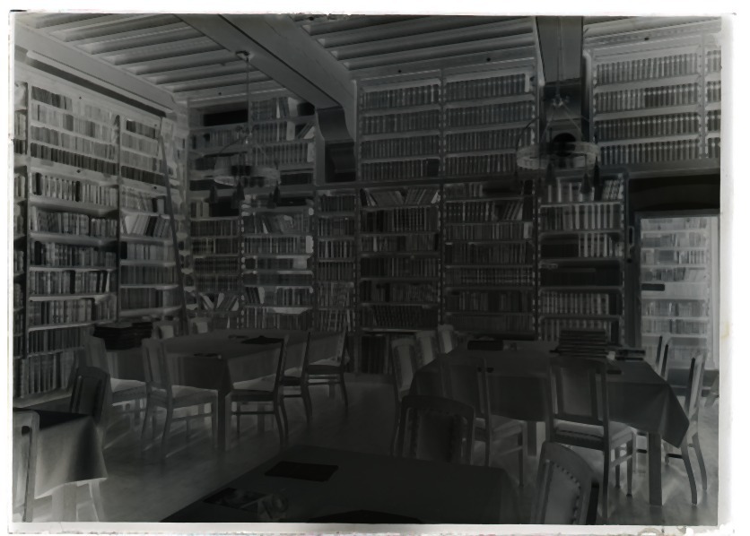 Doos met 20 glasnegatieven van de oude bibliotheek en de tuin van de Kanselarij te Leeuwarden en van ontwerptekeningen van molens door J. Westra in 1933