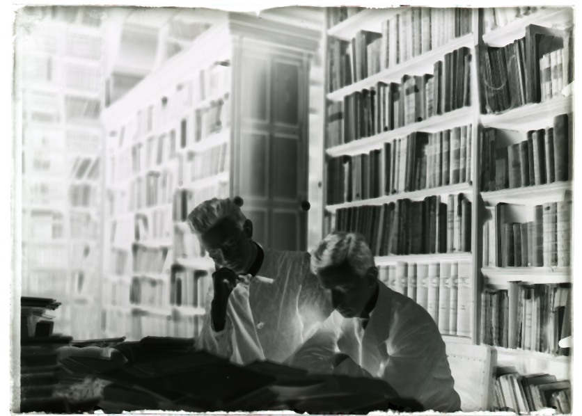 Doos met 20 glasnegatieven van de oude bibliotheek en de tuin van de Kanselarij te Leeuwarden en van ontwerptekeningen van molens door J. Westra in 1933