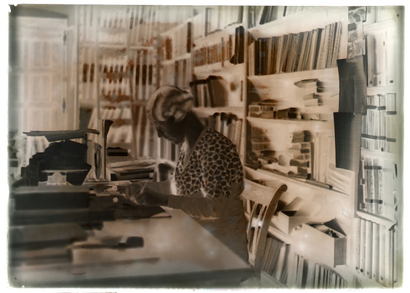 Doos met 20 glasnegatieven van de oude bibliotheek en de tuin van de Kanselarij te Leeuwarden en van ontwerptekeningen van molens door J. Westra in 1933