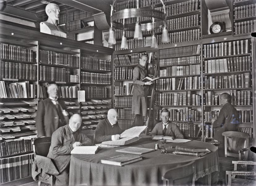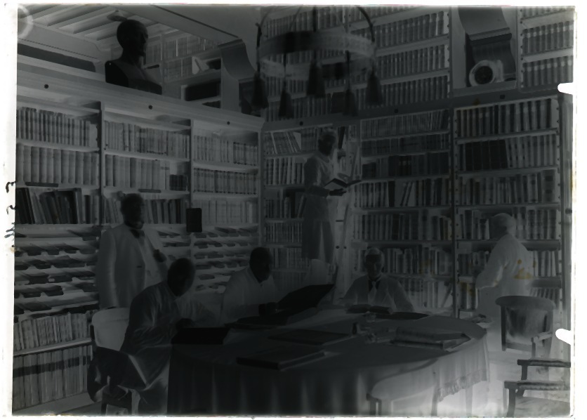 Doos met 20 glasnegatieven van de oude bibliotheek en de tuin van de Kanselarij te Leeuwarden en van ontwerptekeningen van molens door J. Westra in 1933