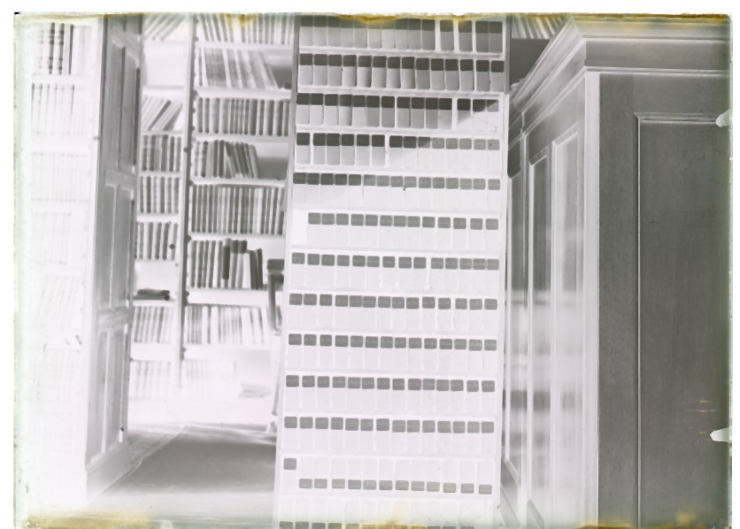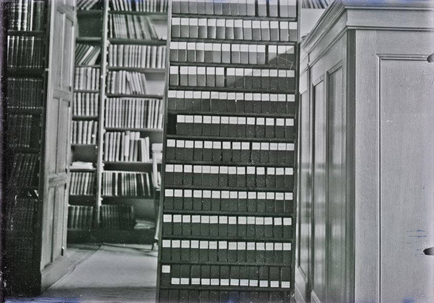 Doos met 20 glasnegatieven van de oude bibliotheek en de tuin van de Kanselarij te Leeuwarden en van ontwerptekeningen van molens door J. Westra in 1933