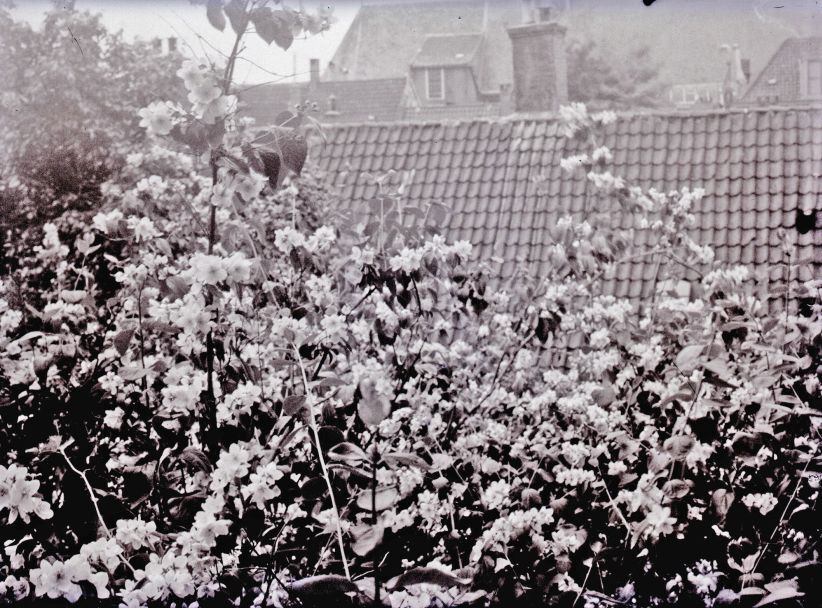 Doos met 20 glasnegatieven van de oude bibliotheek en de tuin van de Kanselarij te Leeuwarden en van ontwerptekeningen van molens door J. Westra in 1933