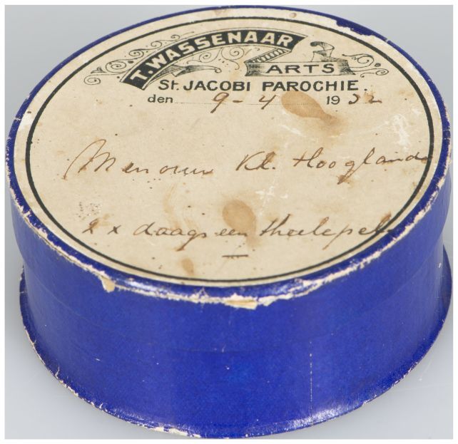 Ronde kartonnen medicijndoosje arts T. Wassenaar, Sint Jacobiparochie