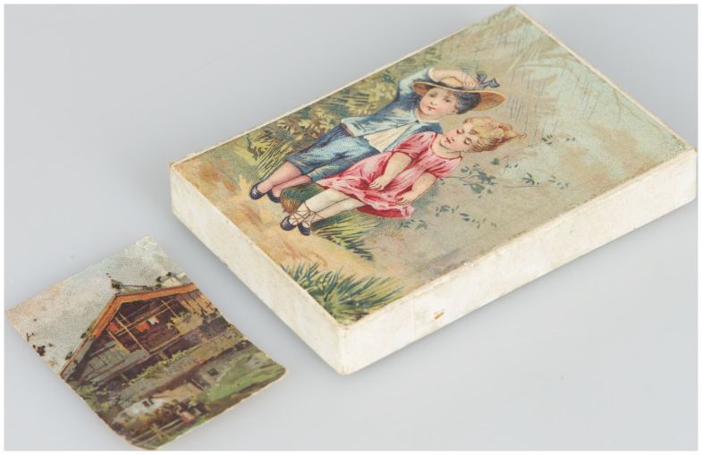 Rechthoekig deksel van een doosje met kleurenplaatje van twee kleuters, Frans Brugsma te Groningen